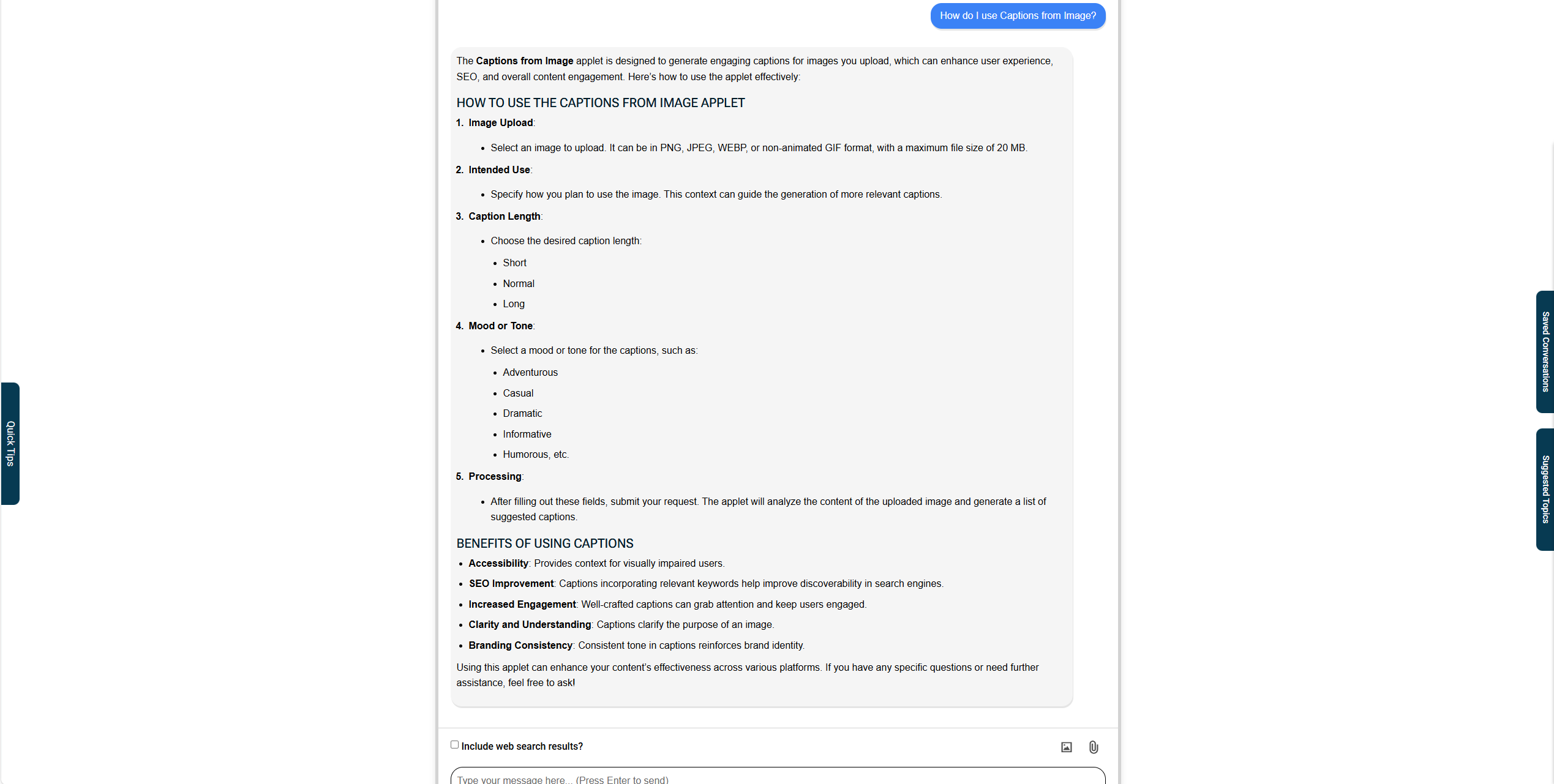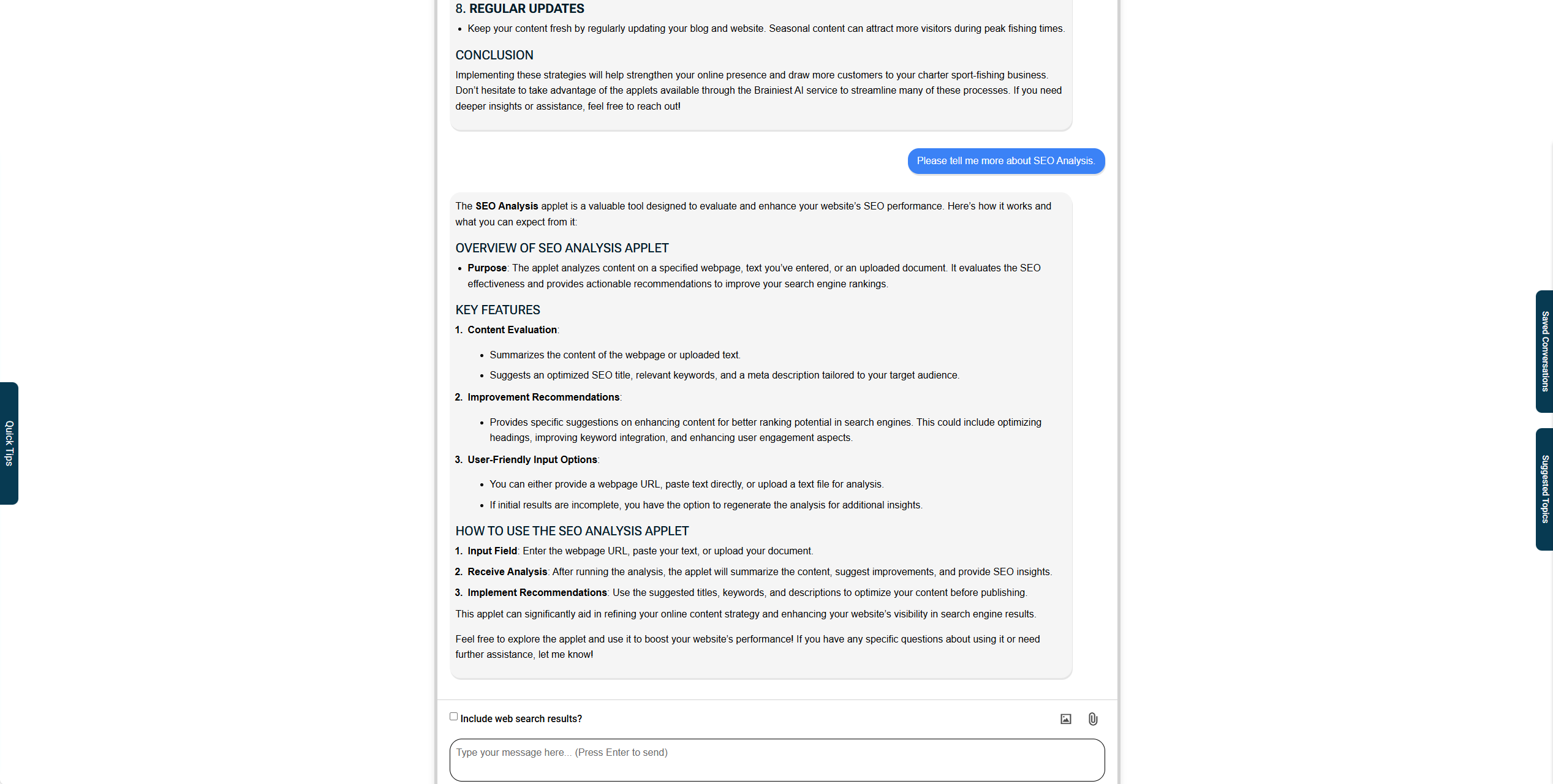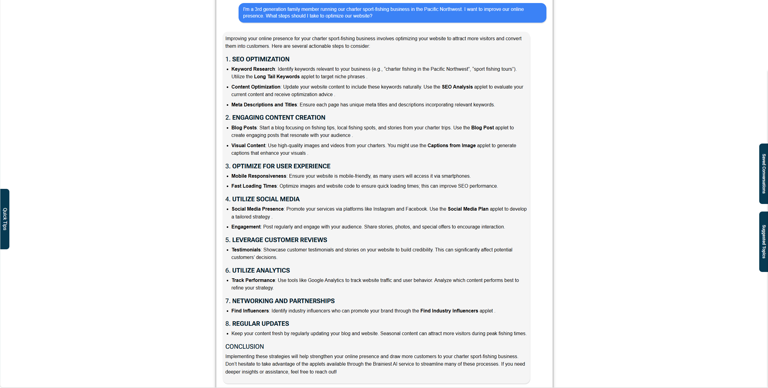 You may use Chat to brainstorm ideas for your business through a conversation with our Brainstorming AI-Assistant. Help from Astro is available for guidance on using the applets and to answer general questions about our service. Research will help you quickly get a clear, concise response using the latest information available on the internet.