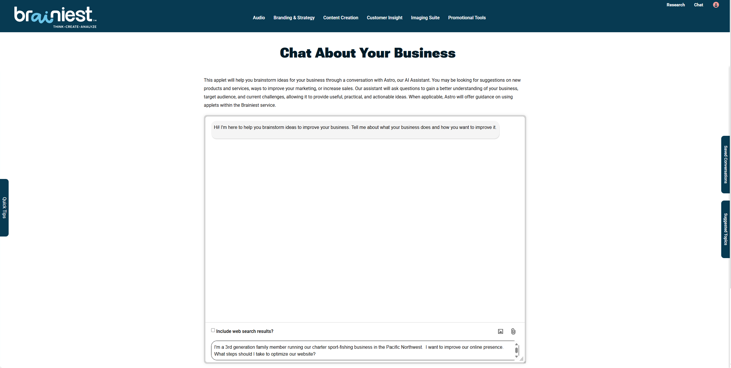 Brainiest is a web-based service consisting of numerous applets capable of generating high-quality marketing documents along with Chat, Help from Astro and Research. The applets are organized by these categories: Audio, Branding & Strategy, Content Creation, Customer Insight, Imaging Suite, and Promotional Tools.